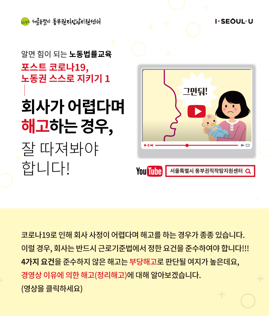| 59 | 10월 기획강좌 틈틈이 노동팁Ⅲ : 출산전후휴가 2편_ ‘5인 미만 사업장 노동자인 나, 출산휴가, 육아휴직 갈 수 있을까요??’ (2) | 동부권직장맘지원센터 | 2021-10-25 | 1748 |