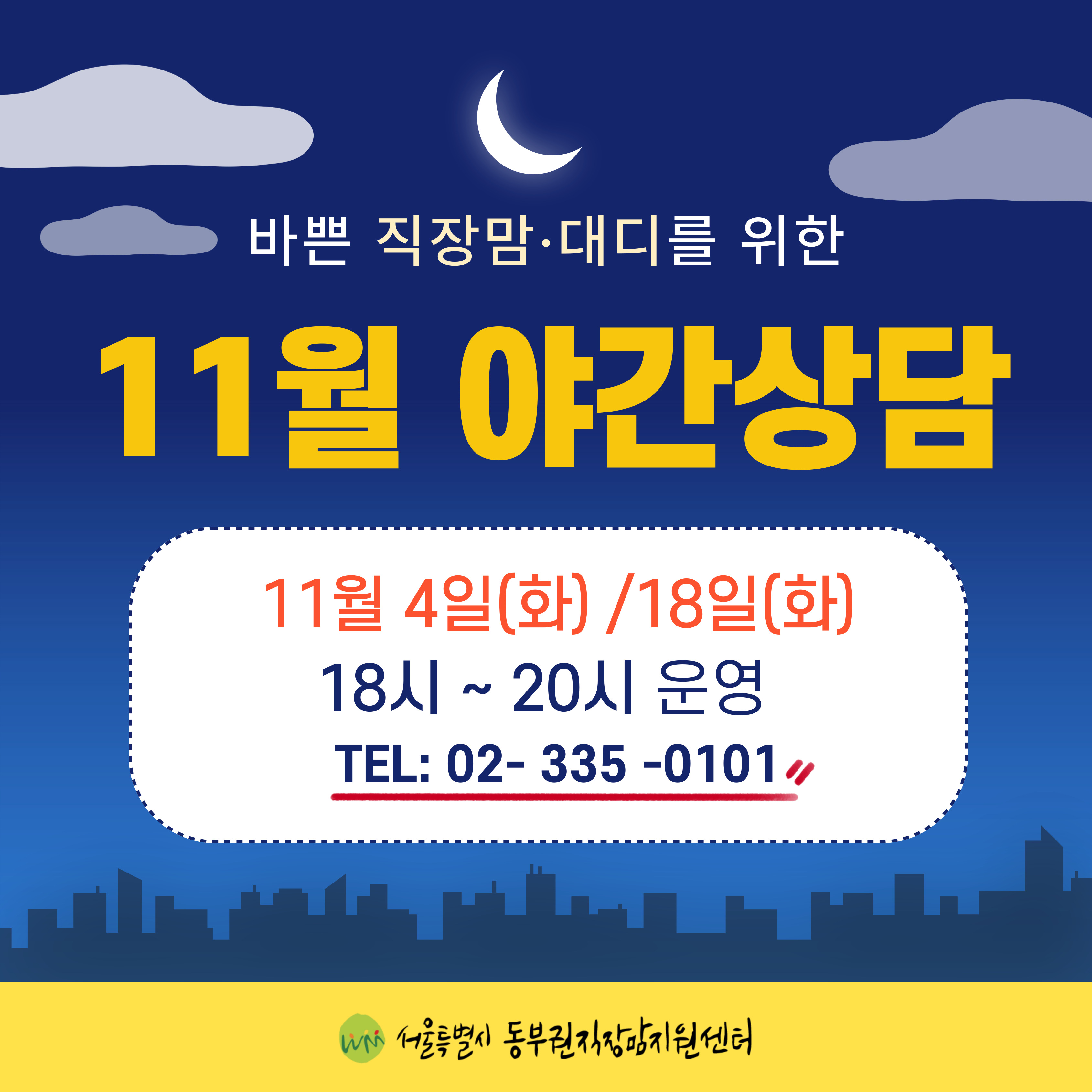 | 231 | 11월 야간상담 일정 안내 | 동부권직장맘지원센터 | 2025-11-03 | 5 |