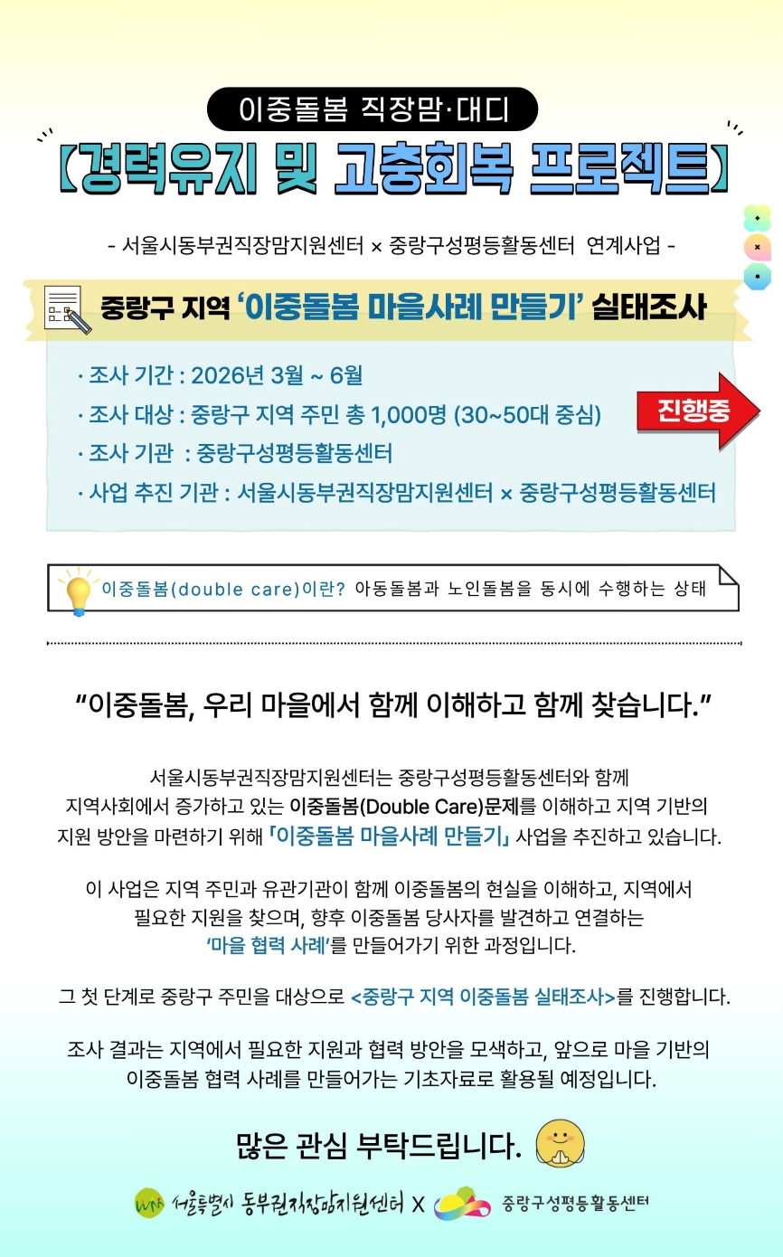 | 242 | 2026 이중돌봄 직장맘·대디【경력유지 및 고충회복 프로젝트】: 중랑구 ‘이중돌봄 마을사례 만들기’ 실태 조사 진행 | 동부권직장맘지원센터 | 2026-03-11 | 25 |