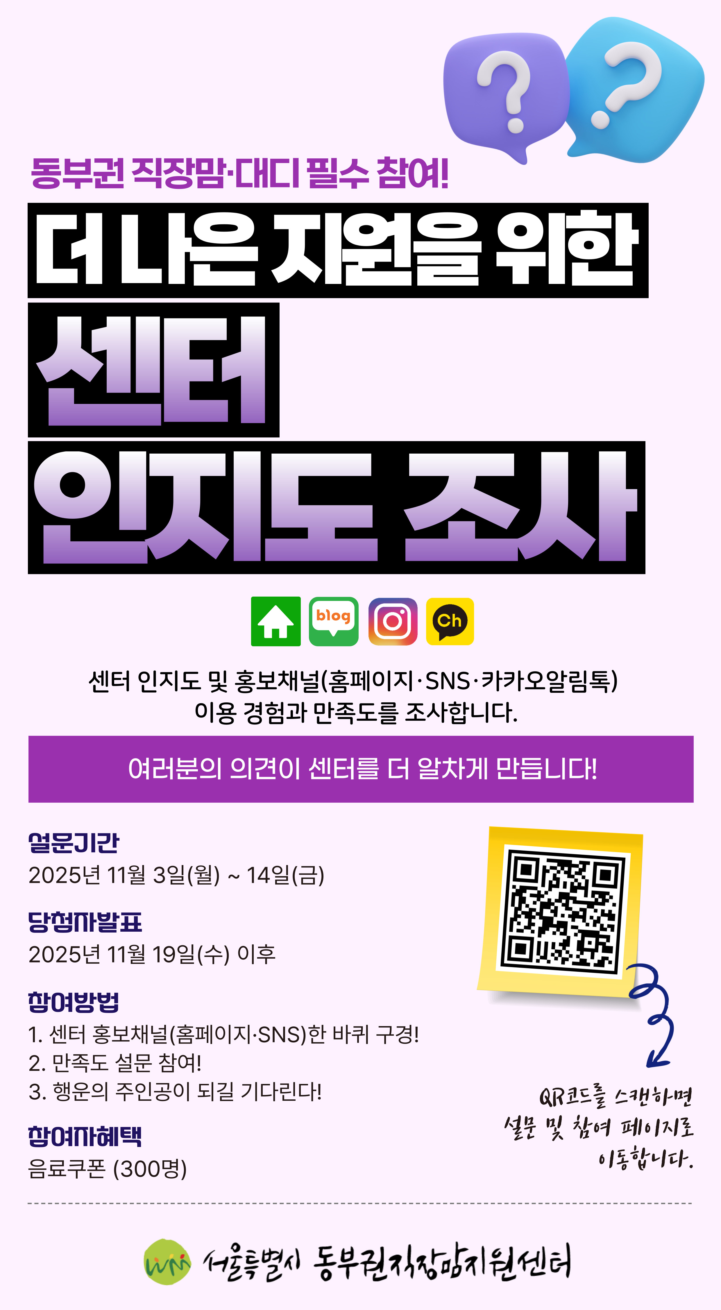 | 211 | 더 나은 지원을 위한 ✨센터 인지도 조사✨(~11/14) | 동부권직장맘지원센터 | 2025-11-03 | 33 |