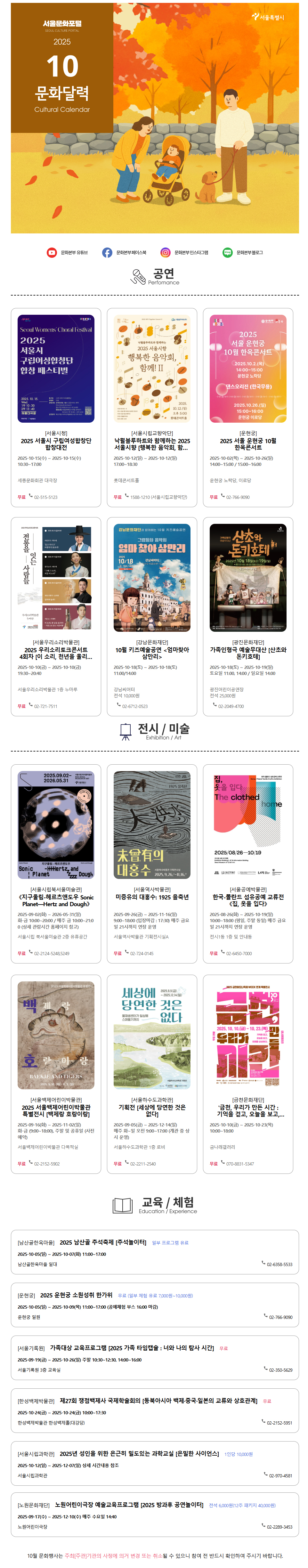 1205 | [정보] 서울시, 2025. 10월 문화달력 | 동부권직장맘지원센터 | 2025-10-13 | 14 |