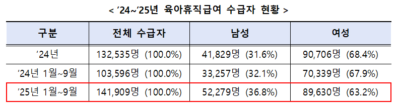 -2025년 1∼9월까지 육아휴직급여 수급자 수 141,909명으로 작년 연간 수급자 추월