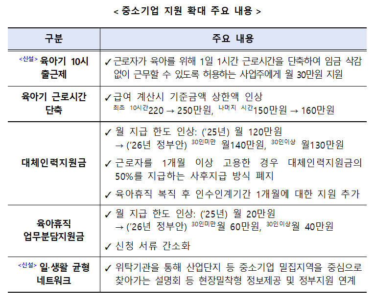 – 근로자가 육아를 위해 하루 1시간 근로시간을 줄이고도 임금이 삭감되지 않도록 허용한 사업주에게 월 30만원을 지원하는 ‘육아기 10시 출근제’를 새롭게 도입