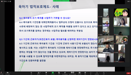 - 앞으로도 센터는 직장맘·대디가 일과 육아를 병행하며 안정적으로 일할 수 있도록 ‘일·생활균형 지킴이’로서의 역할을 이어갈 예정이다.