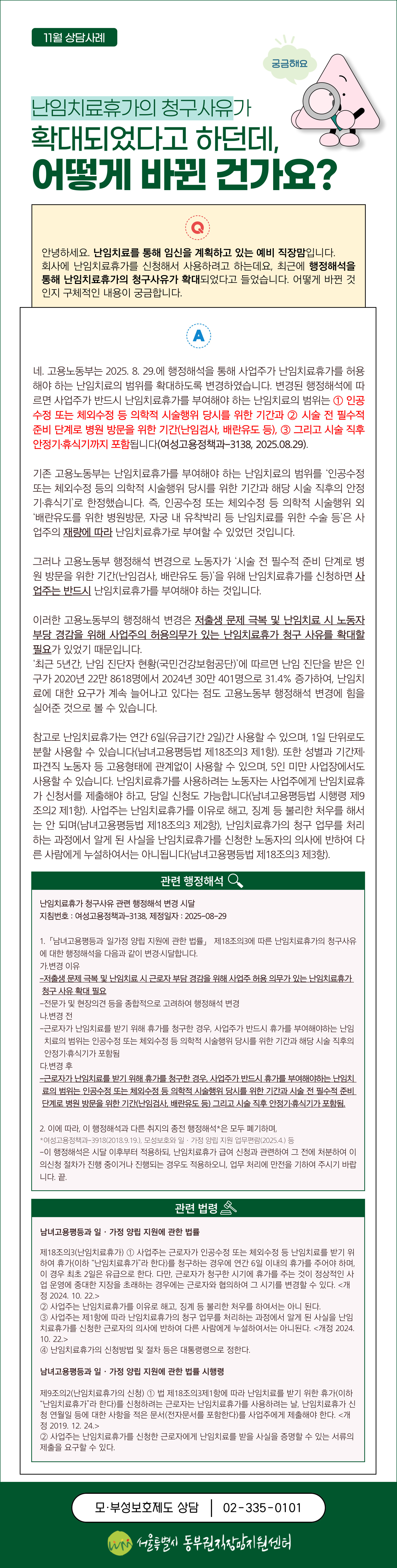 - 출산휴가·육아휴직 등 노동자들의 모·부성보호제도 사용을 적극 권장하면서 어린이집을 운영해오고 있는 원장 A씨는 최근 제도의 잦은 개편으로 인해 본인이 정확히 지원금을 신청하고 있는지, 액수가 맞는지 확인하고자 센터의 문을 두드렸다.