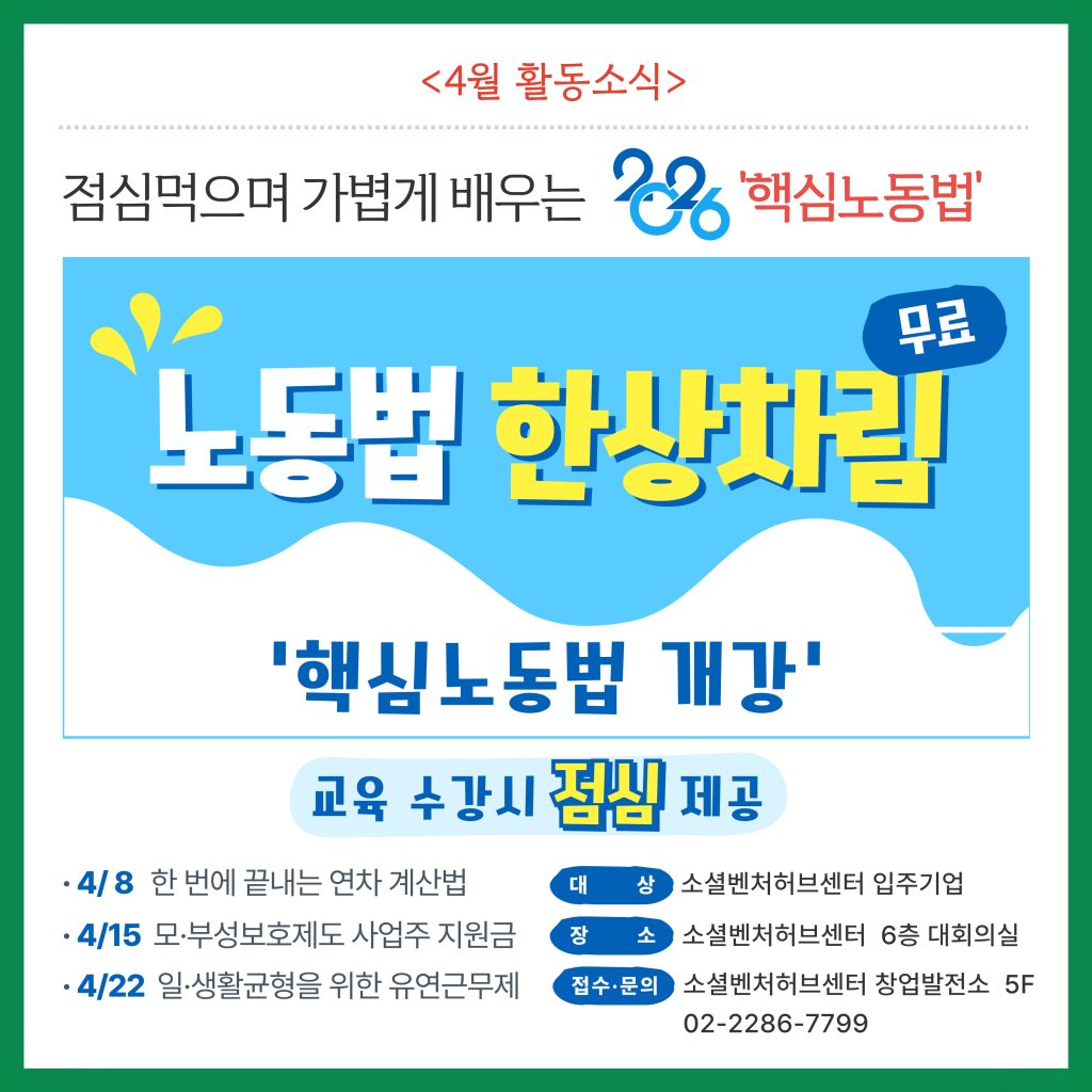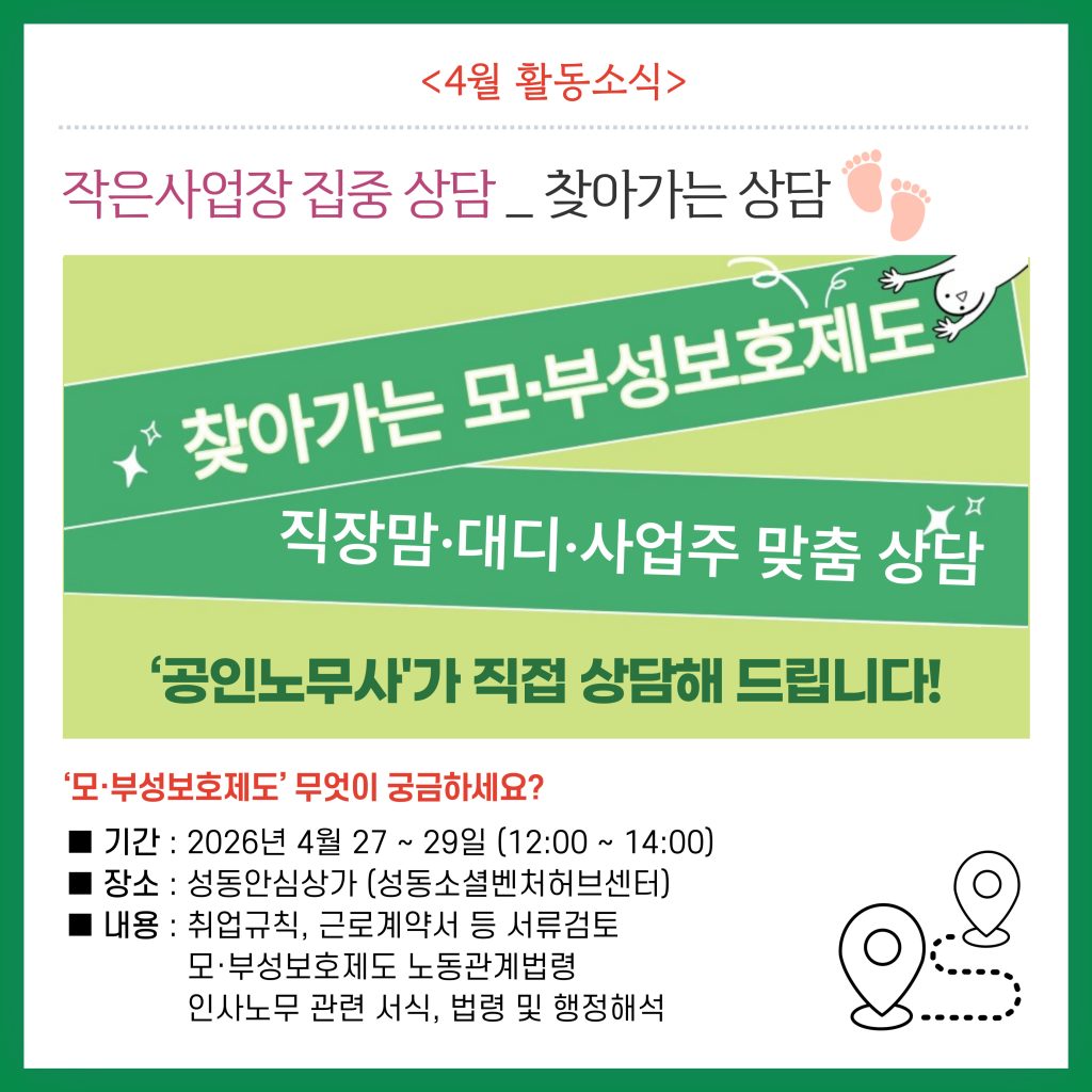 📅 4월 15일(수), 모·부성보호제도 사업주 지원금 📅 4월 22일(수), 일·생활균형을 위한 유연근무제⏰ 📢 <4월 활동소식> 작은사업장 집중 상담_찾아가는 상담👨⚖ ‘공인노무사'가 직접 상담해 드립니다!📑 ■ 기간 : 2026년 4월 27 ~ 29일 (12:00 ~ 14:00) ■ 장소 : 성동안심상가 (성동소셜벤처허브센터)