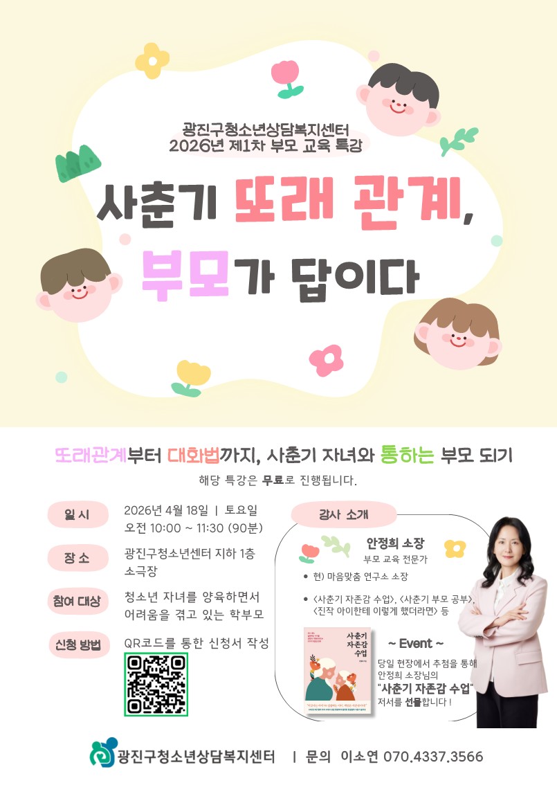 [홍보] 광진구청소년상담복지센터, 상반기 부모교육 ‘사춘기 또래관계, 부모가 답이다’