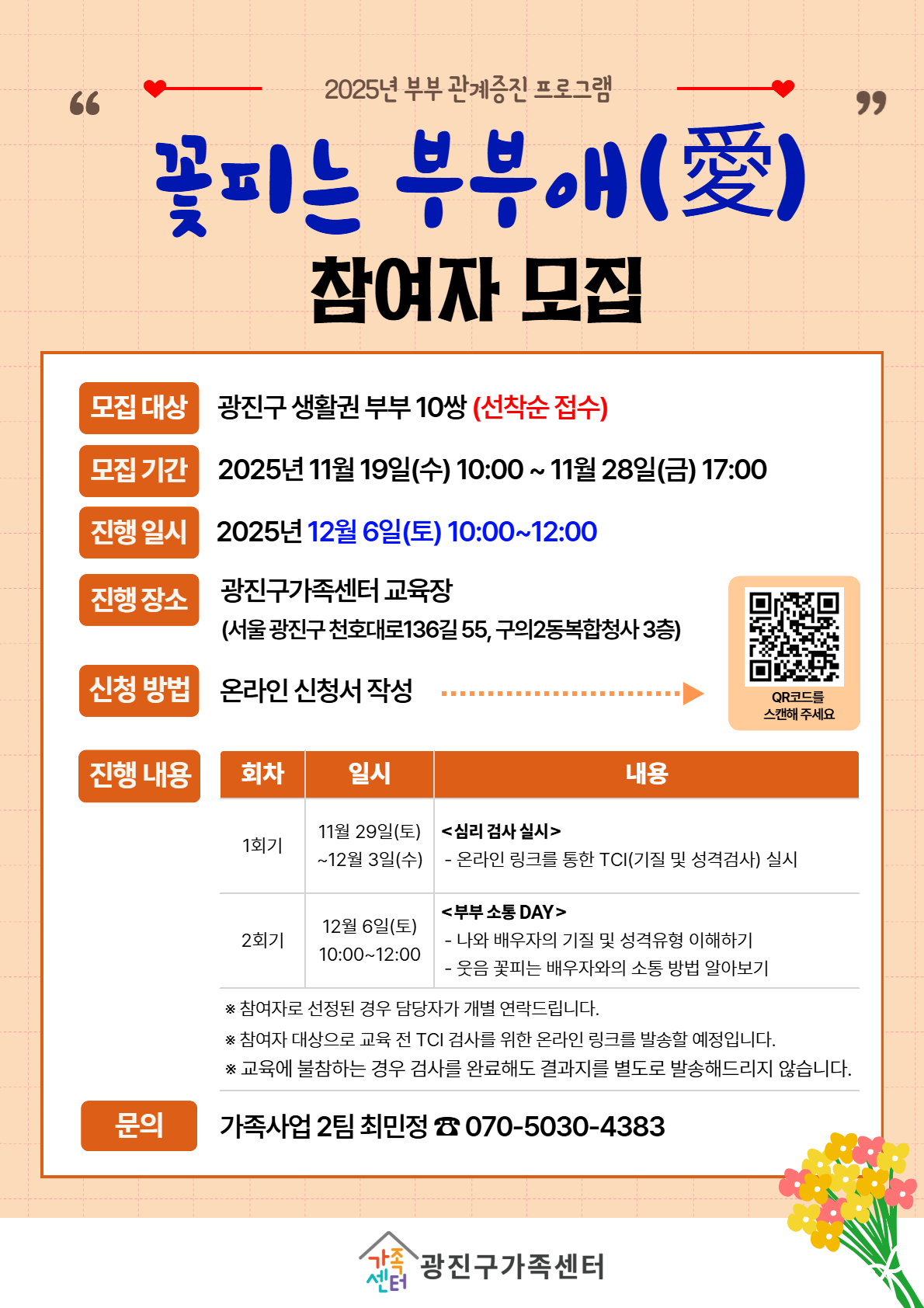 ■  사 업 명 : 2025년 부부 관계증진 프로그램 「꽃피는 부부애(愛)」   ■  사업대상 : 광진구 생활권 부부 10쌍( 선착순 접수)   ■  진행일시 : 2025년 12월 6일(토) 10:00~12:00   ■ 진행장소 : 광진구가족센터 교육장(서울특별시 광진구 천호대로136길 55, 구의2동복합청사 3층)   ■  진행내용 : 부부 기질 및 성격유형 검사, 검사 결과에 따른 나와 배우자 이해하기, 부부 소통교육 등   ■  신청기간 : 2025년 11월 19일(수) 10:00 ~ 11월 28일(금) 17:00   ★ 신청링크★ https://forms.gle/RF5WgEeLKSaH4Nt88