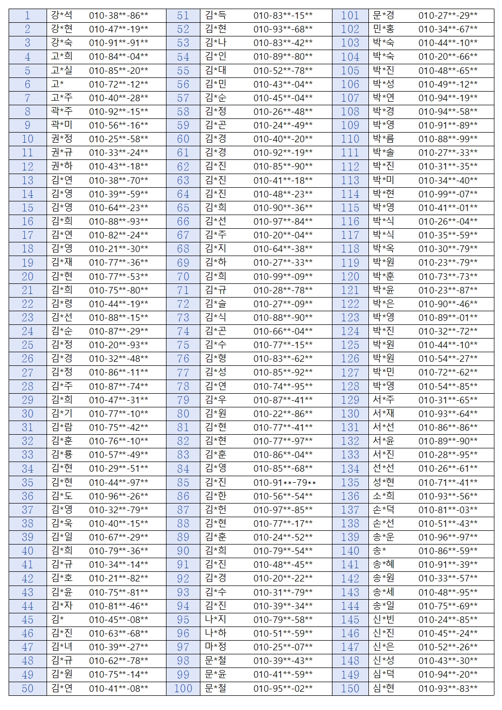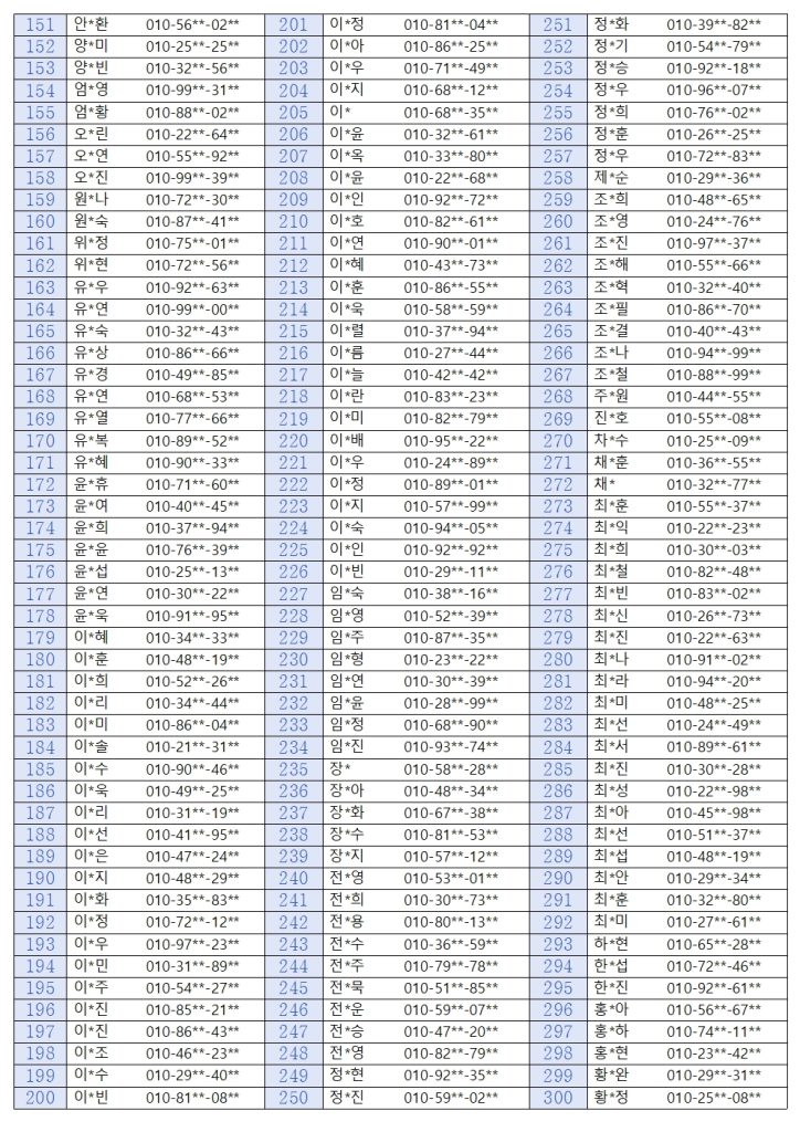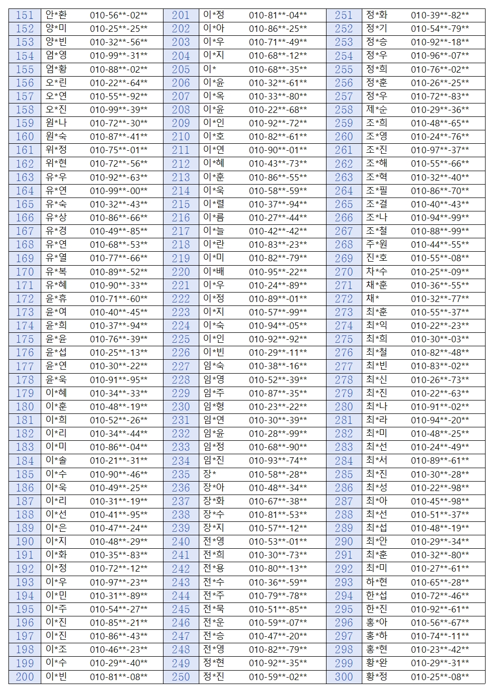 <당첨자 명단_ 총 300명> * 가나다 순 정렬, 성명 , 핸드폰 별표처리