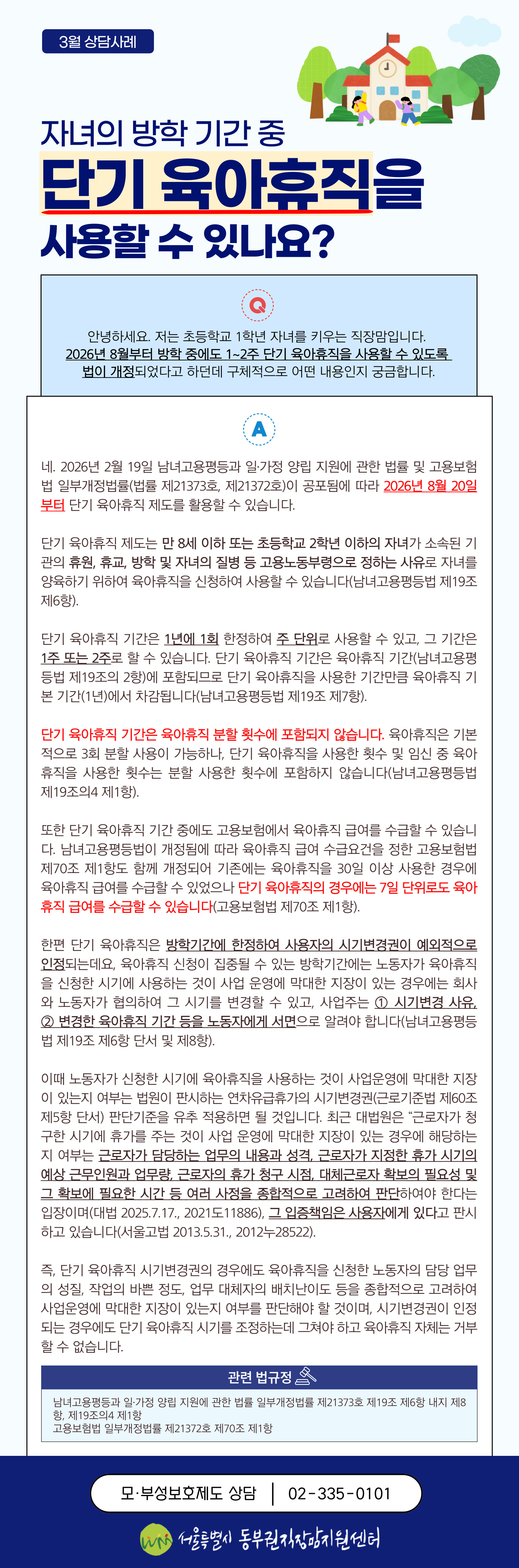 □ 김지희 센터장은 “직장맘·대디가 일터에서 권리를 존중받고, 가정에서는 돌봄과 삶의 여유를 누릴 수 있도록 돕는 것이 우리 사회의 과제”라며 “이번 캠페인을 통해 시민들이 자신의 권리를 자연스럽게 알게 되는 계기가 되고, 일과 삶이 함께 존중받는 일터 문화로 이어지길 기대한다”고 밝혔다.