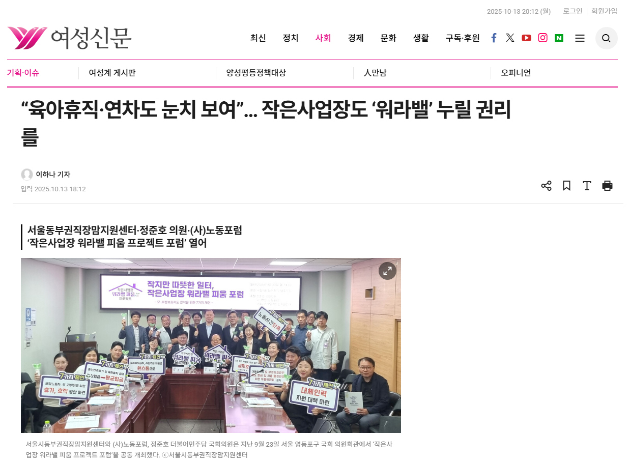 [여성신문] “육아휴직·연차도 눈치 보여”… 작은사업장도 ‘워라밸’ 누릴 권리를