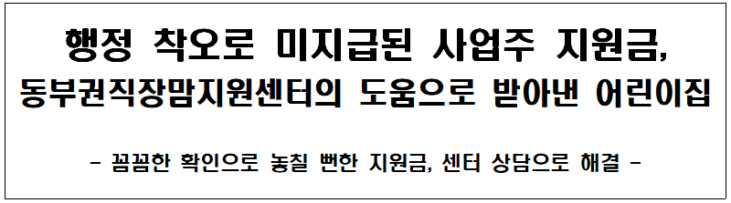 □ - 서울특별시 동부권직장맘지원센터(센터장 김지희, 이하 센터)가 사업주와의 밀착 상담을 통해 육아휴직을 허용한 사업주에게 지원하는 출산·육아기 고용안정장려금(육아휴직 지원금)과 관련한 행정상 착오를 발견, 어린이집 사업주가 받지 못했던 사업주 지원금을 받을 수 있게 되었다고 6일 전했다.