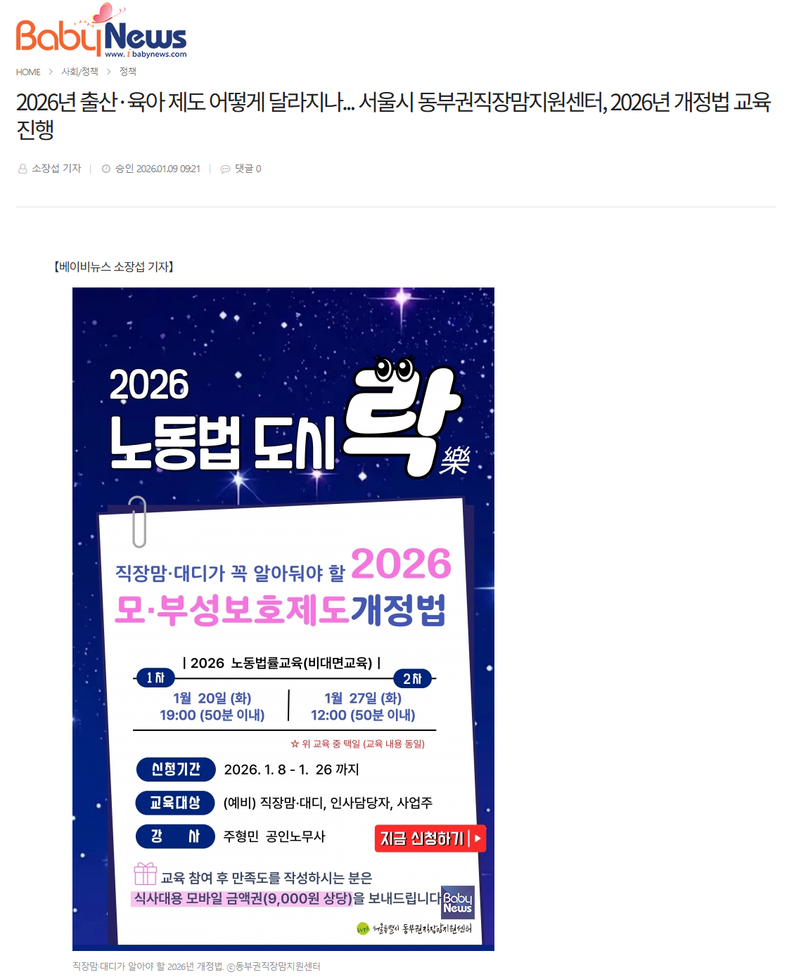 - 앞으로도 센터는 직장맘·대디가 일과 육아를 병행하며 안정적으로 일할 수 있도록 ‘일·생활균형 지킴이’로서의 역할을 이어갈 예정이다.