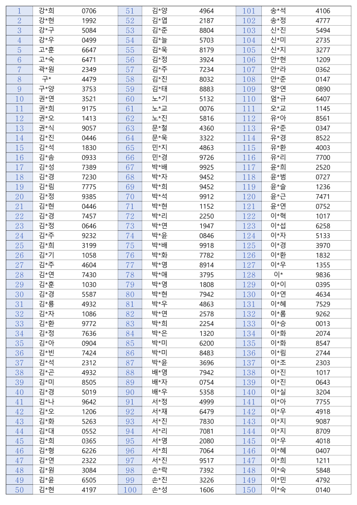 <당첨자 명단_ 총 200명> * 가나다 순 정렬, 성명 , 핸드폰 뒤 네자리만