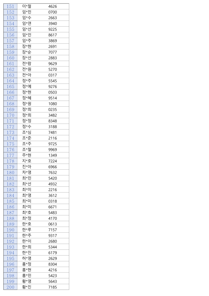 <당첨자 명단_ 총 200명> * 가나다 순 정렬, 성명 , 핸드폰 뒤 네자리만